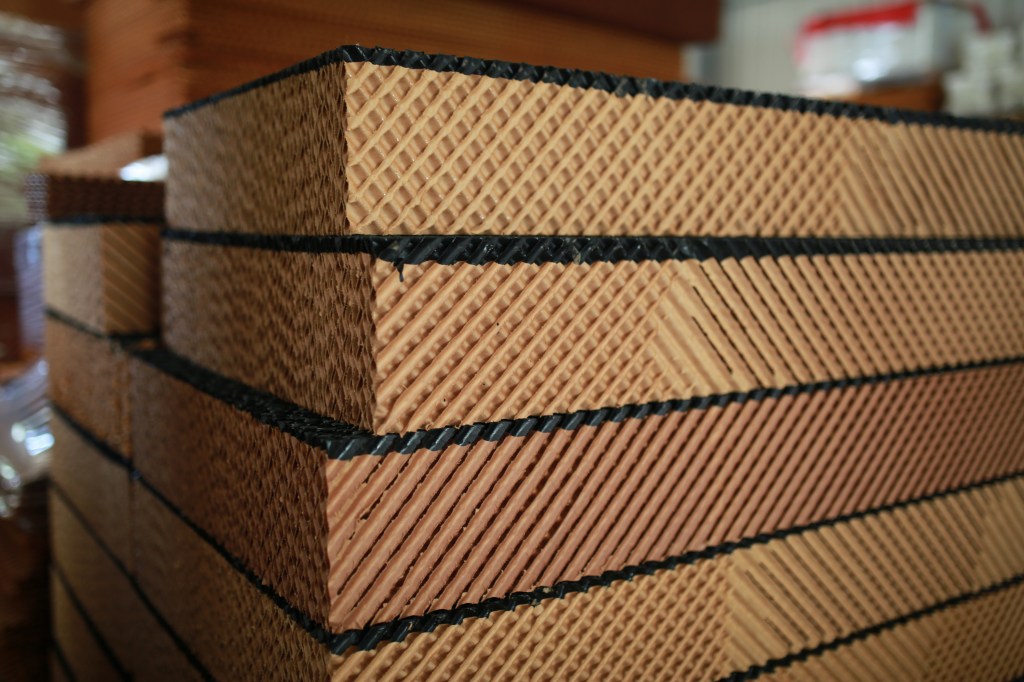 水簾片:是一種特殊紙製蜂窩結構促成的紙製材料,使用水簾片並利用水蒸發吸收熱量自然現象而達到散熱的效果!